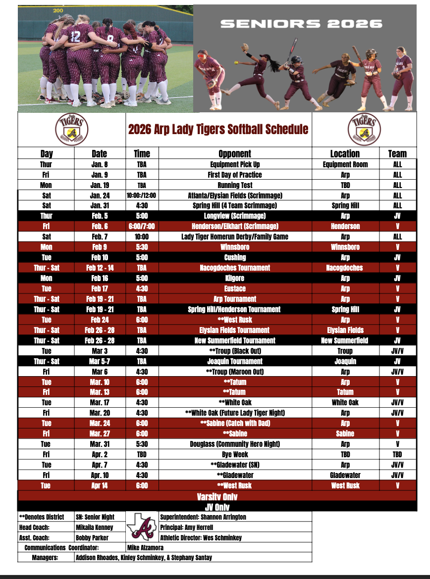 | 02/24/2026 | District | Arp Tigers | 12-2(L) | 4-9-1 |