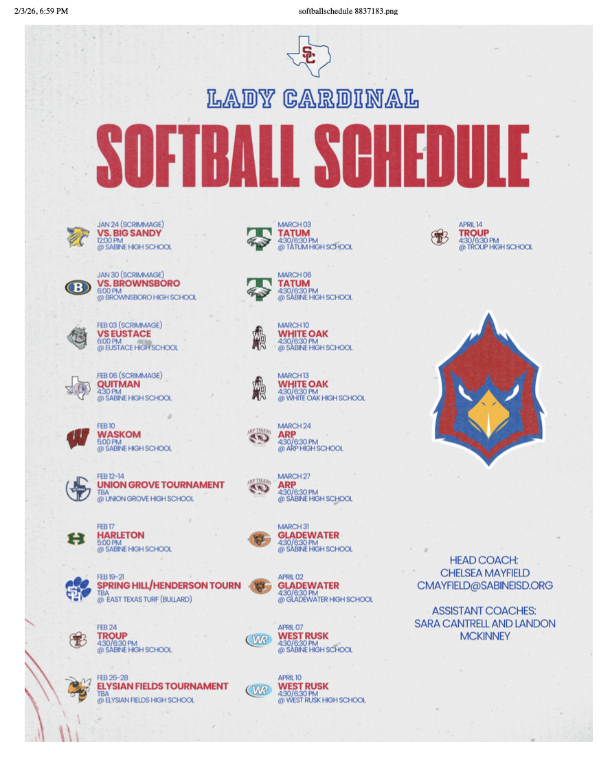 | 02/24/2026 | District | Gladewater Sabine Cardinals | 10-4(W) | 8-6-0 |