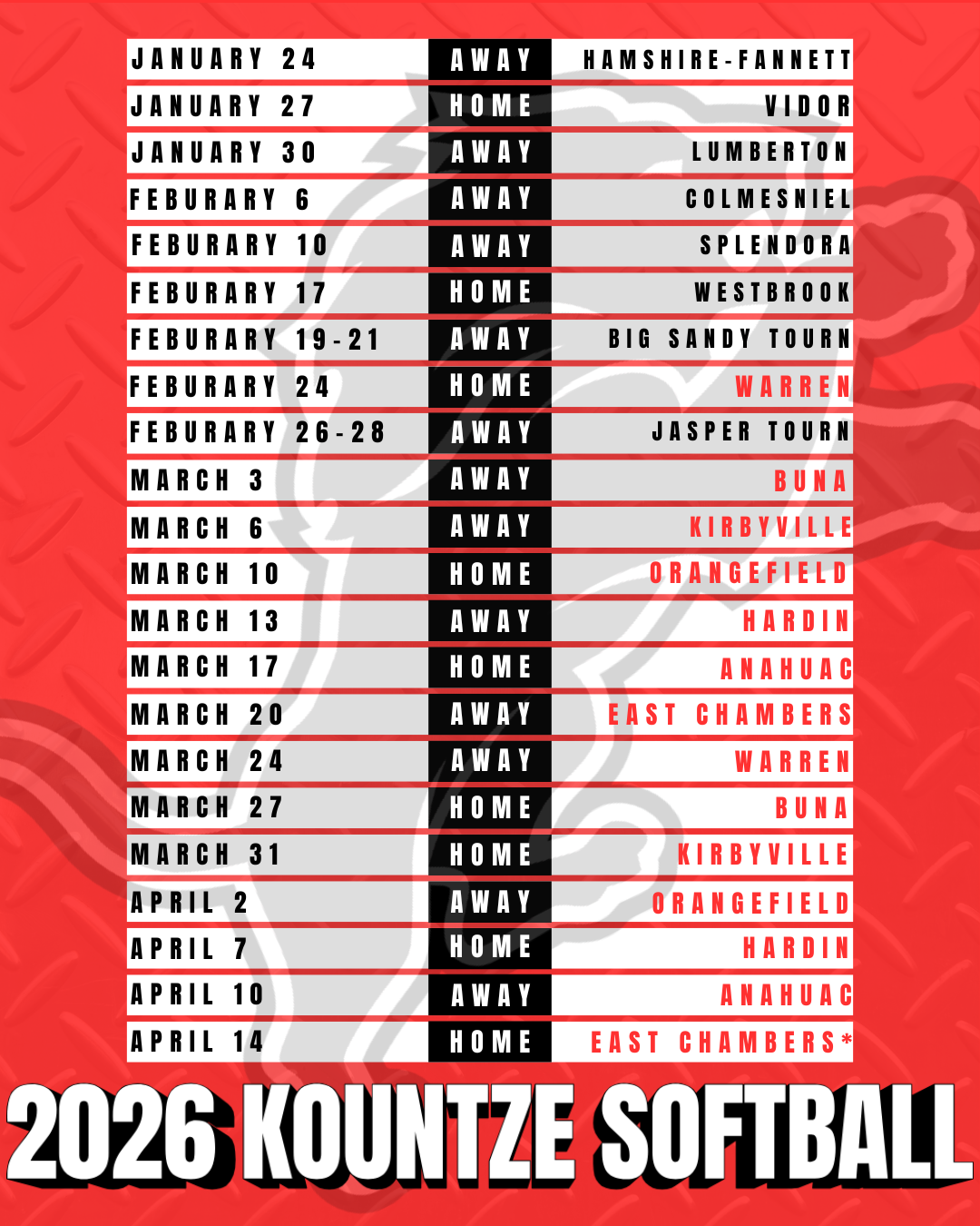 | 02/24/2026 | District | Kountze Lions | 10-0(W) | 11-0-0 |
