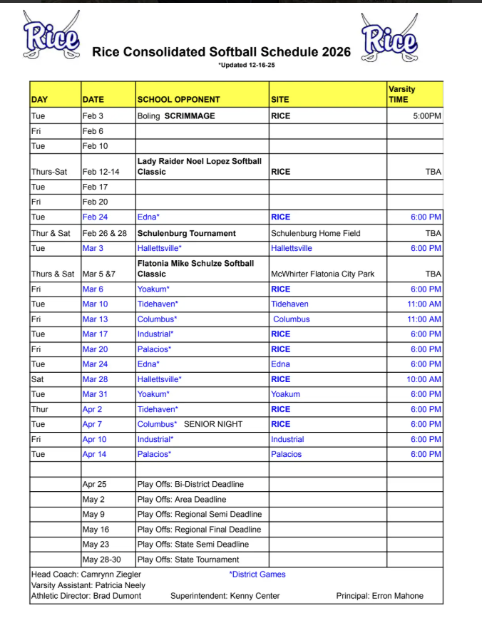 | 02/10/2026 | Regular | El Campo Ricebirds | 10-0(L) | 0-1-0 |