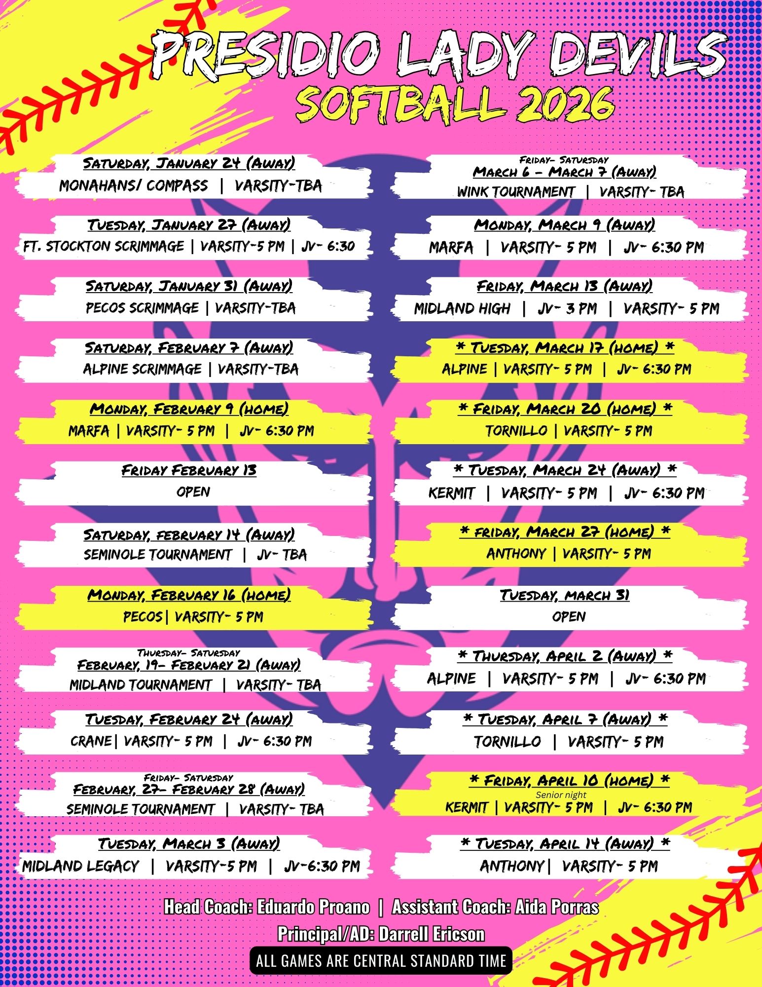 | 02/27/2026 | Tournament | San Angelo Lake View Chiefs | 18-10(L) | 3-10-0 |