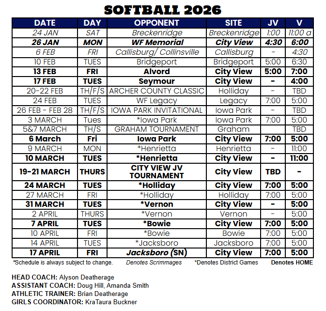 | 02/23/2026 | Regular | Childress Bobcats | 15-0(L) | 0-1-0 |