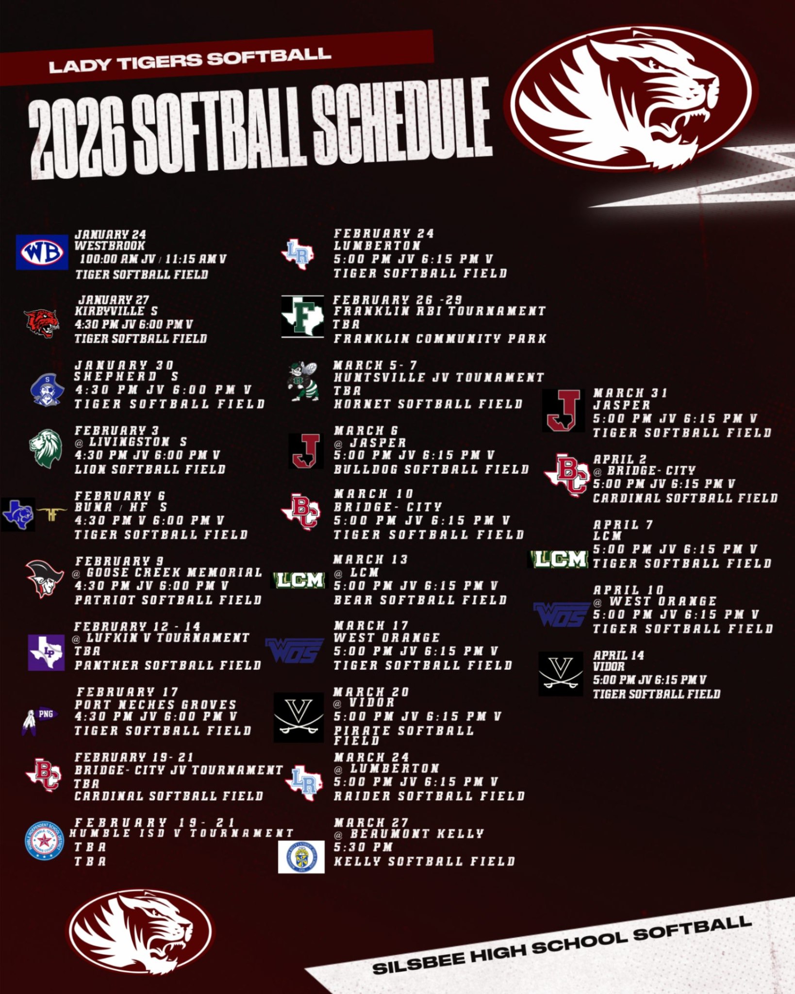 | 02/24/2026 | District | Silsbee Tigers | 11-10(L) | 5-8-0 |