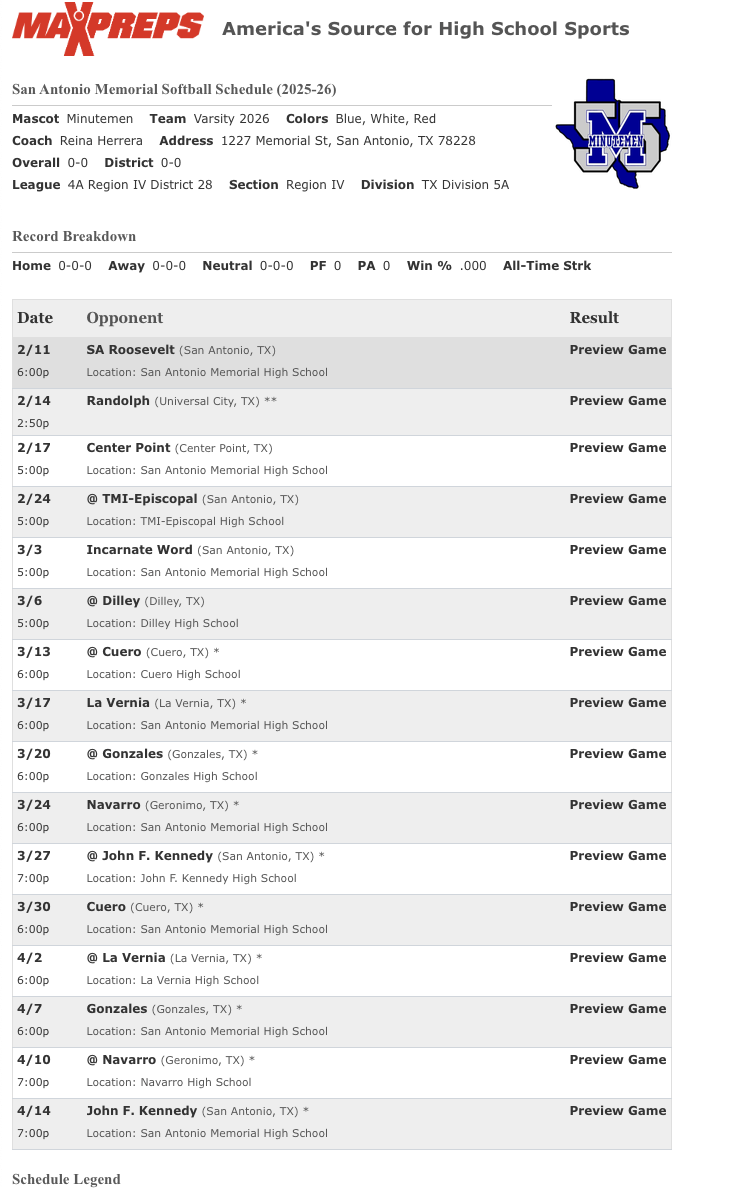 | 02/10/2026 | Regular | San Antonio Brackenridge Eagles | 11-0(W) | 1-0-0 |
