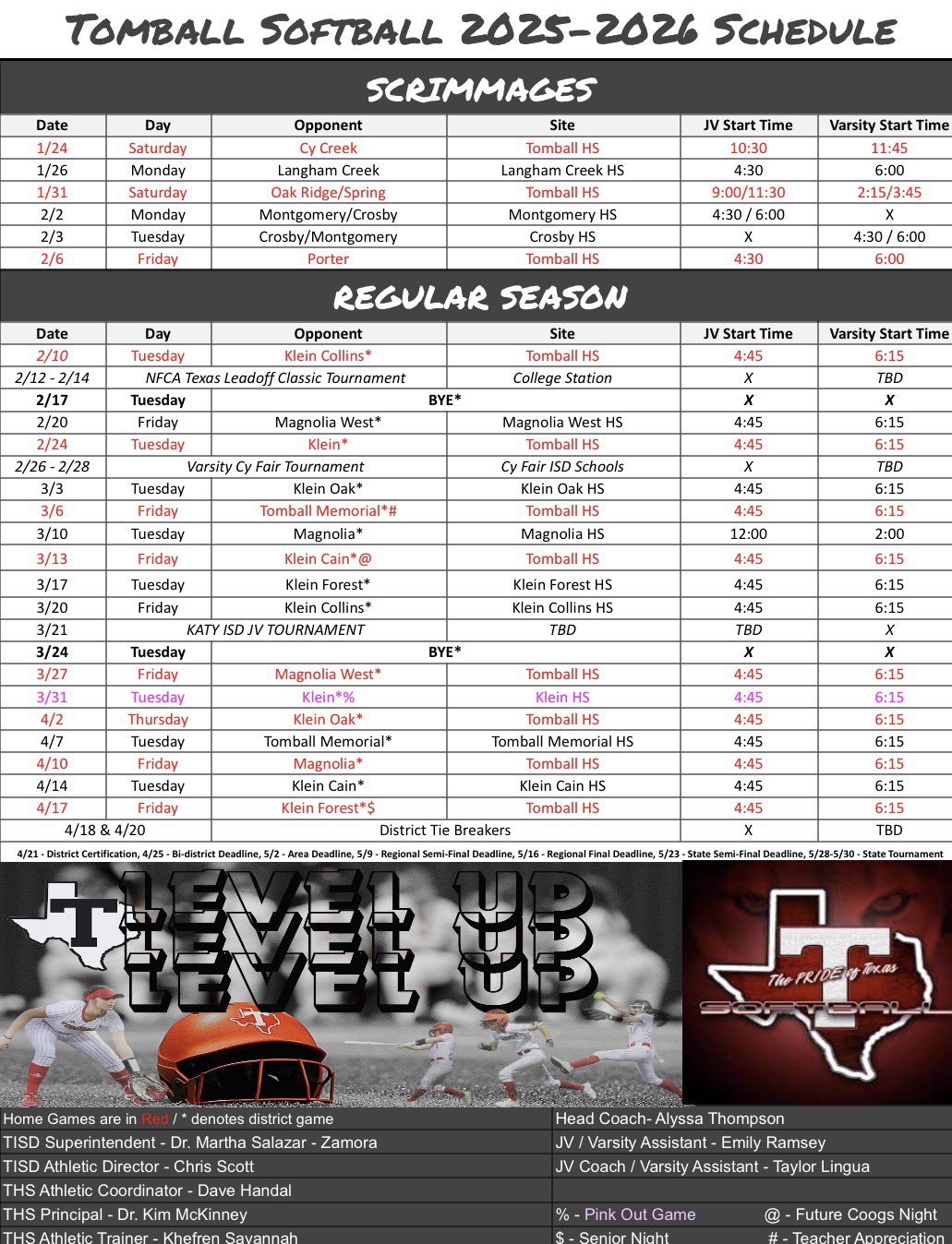 | 02/20/2026 | District | Tomball Cougars | 14-2(L) | 6-2-0 |