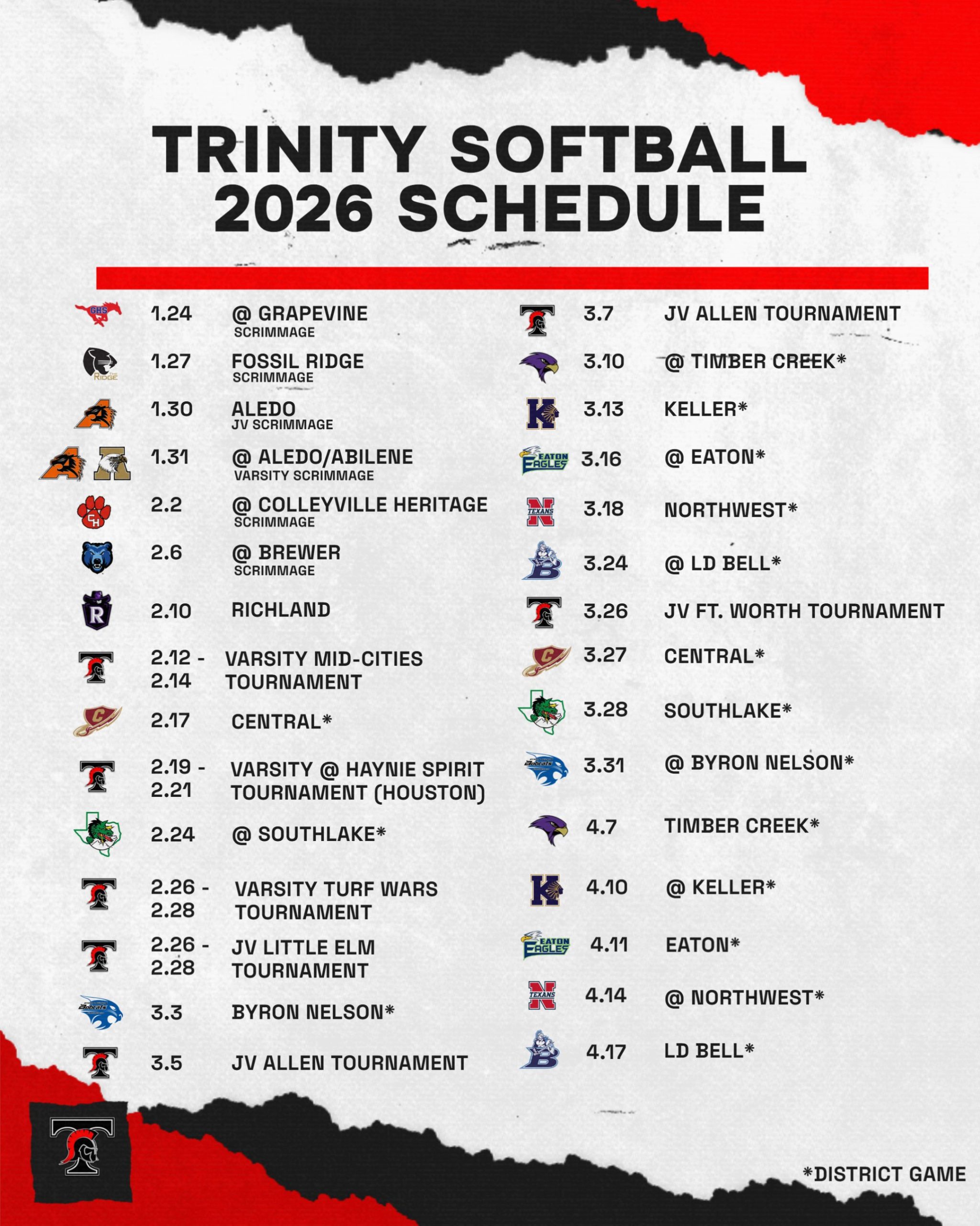 | 02/17/2026 | District | Euless Trinity Trojans | 6-1(L) | 4-2-0 |