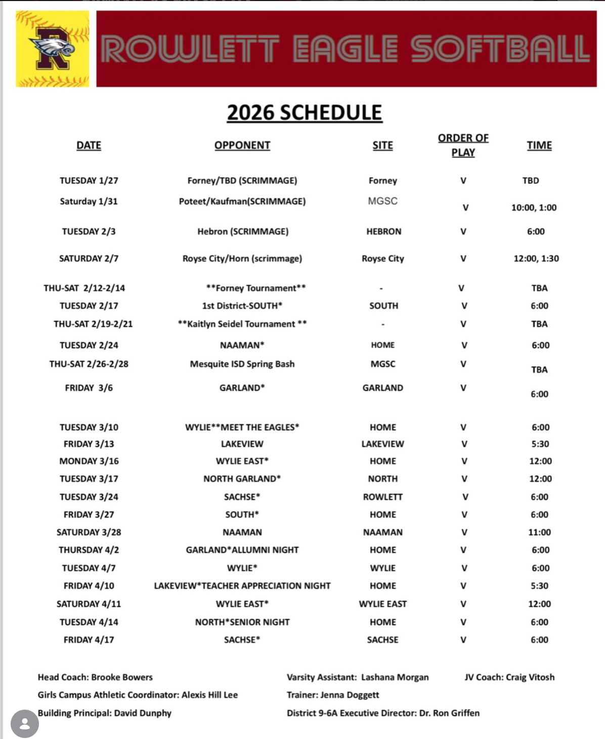 | 02/24/2026 | District | Garland Owls | 20-0(L) | 0-9-0 |